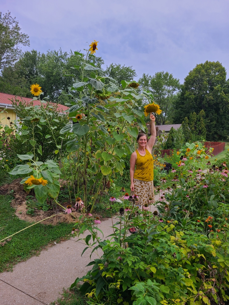 The greatest joy is not just this — though it is great to bring in food from the garden and lay it out on the table and store some for the lean months. The big joy for me is that between the plants that feed me there is space to to put in flowers and fruits to feed the critters of this dwindling world. There is space between for sunflowers and milkweed and cardinal flowers and black-eyed Susans and crimson clover where a rabbit nibbles in the mornings. The space that was once all grass soaked in herbicides now supports wildlife from aphids to goldfinches, from honey bees to rabbits and even me.